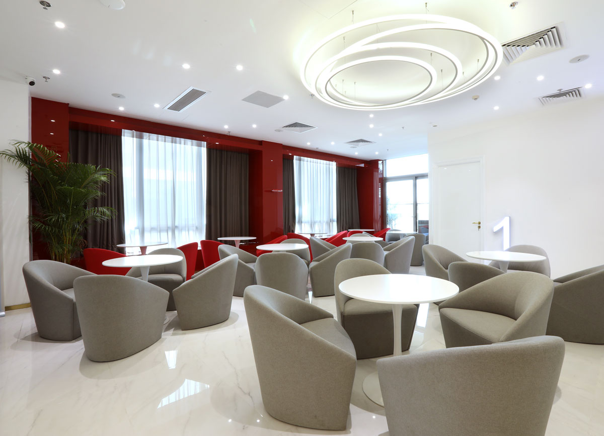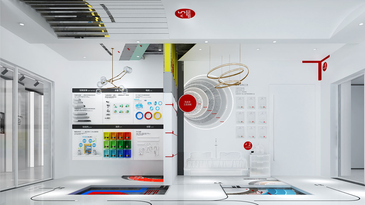 在空間色調的選擇上,我們與品牌VI結合,取自LOGO的配色,白色,黑色,紅色。白色為背景色,使空間更純粹。黑色為輔助色,主要用于一些主要交通節(jié)點的空間。使空間層次更豐富鮮明。紅色為點綴點,主要用于重點區(qū)域,起到提亮空間的作用。使空間更聚焦。