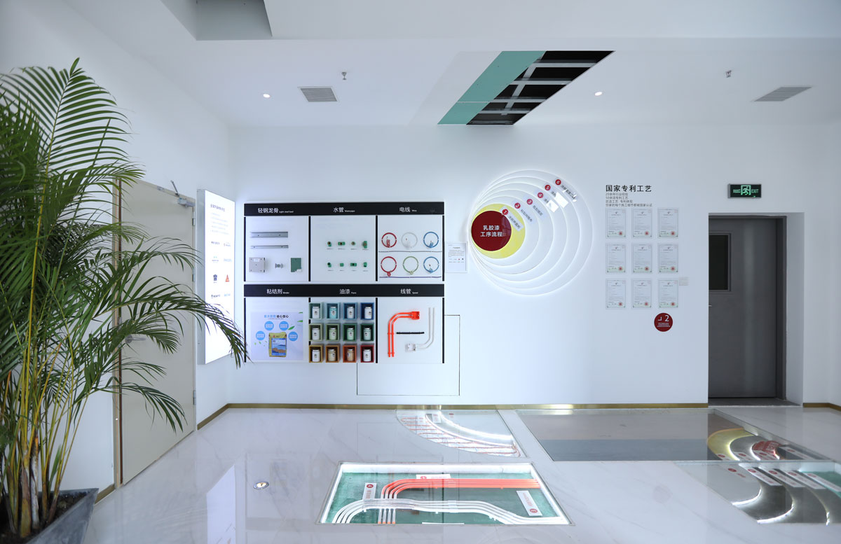 在空間線條的選擇上,我們品牌的輔助圖形相結合,取自其局部圖形。直與曲相結合,使空間簡潔,又不失靈動。在空間的整體模塊空間設計上,我們用體塊交叉的方式,使空間的層次更豐富。